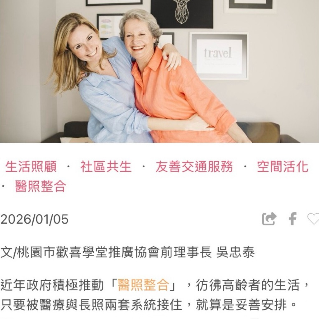 【歡喜學堂協會專欄】 高齡政策不能只靠「醫照整合」──把生活放回高齡者手裡 專欄文章網址如下 點擊這